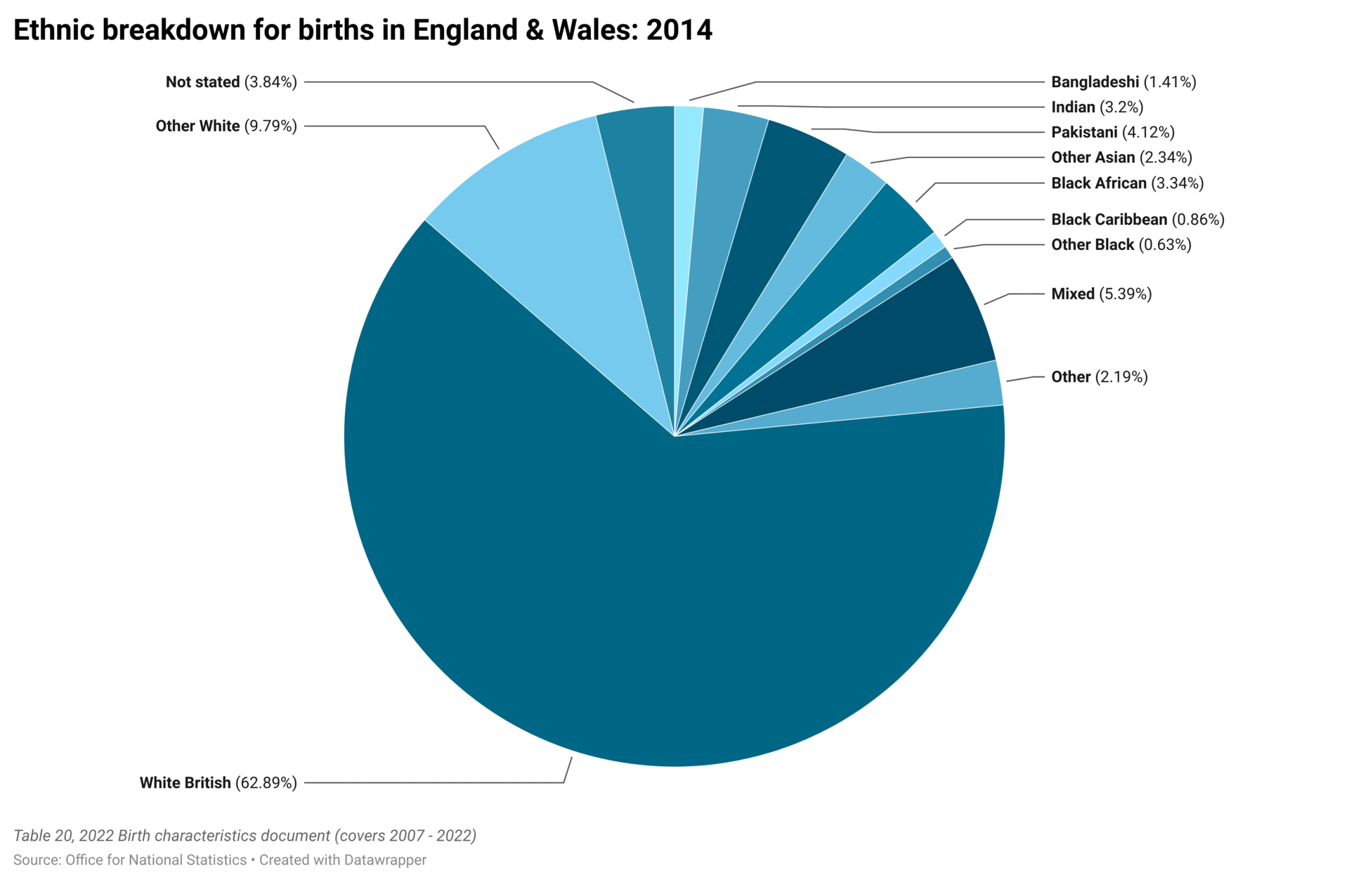 39.5% of births in England & Wales had at least one foreign-born parent. For England specifically, this figure was higher, at 40.4%, meaning 4 in 10 babies born in England last year had at least one foreign-born parent.