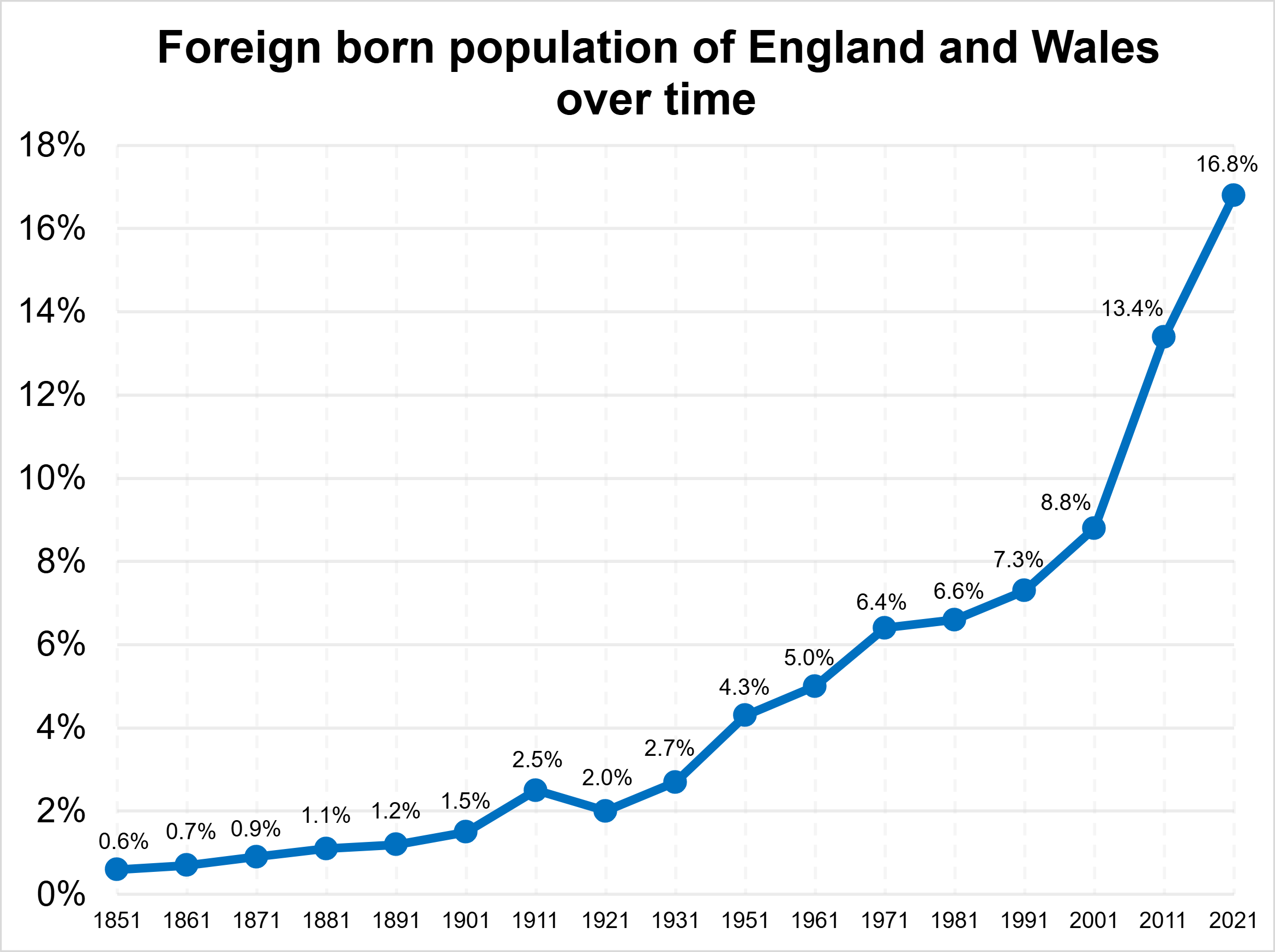 When the 2021 Census was conducted, 16.8% of England & Wales was foreign-born — or over ten million people — and this figure won’t include those who arrived during the so-called ‘Boriswave’. There is a fantastic chart on Wikipedia that shows the percentage of the population of England & Wales that is foreign-born, from the 1851 to 2021 Census — note how stable this figure was from 1961 to 1991, with an increase of only 2.3% over a 30-year period, as well as the sharp increase after 1997.