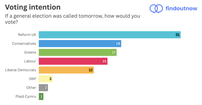 At the time, FindOutNow had Reform far ahead of any other party in standard polling at 31%. Whilst the two polls used different methodology, and therefore should not be understood as directly comparable, there is at least some suggestion here that Restore could have an impact on Reform’s polling position — although, interestingly, their support seems to be drawn equally from Reform and the Conservatives.