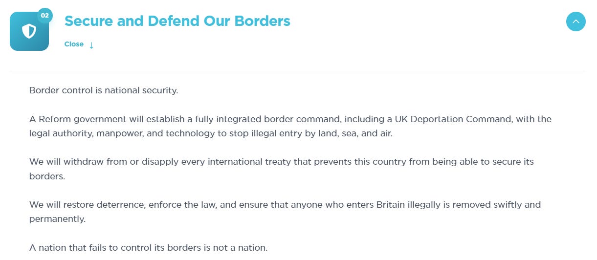 ‘Restore have promised to deport every illegal migrant, abolish the existing asylum system, and thereby end the housing of illegal migrants at the taxpayer’s expense. This is precisely the same policy as Reform, down to the precise language of ‘detain and deport’ and ‘mass deportations’, as their website makes clear: