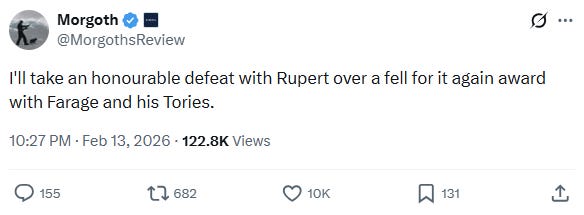 This choice may have been entirely reasonable at the time, but it certainly shows that Lowe is not the committed anti-Tory that many of his supporters make him out to be. It is also very strange that Lowe was able to see this logic in 2019, but does not seem to see it in 2026 — when the stakes are far higher, and the reward much greater. Why did Lowe feel that Johnson’s Conservatives were worth endorsing, yet Farage’s Reform has to be resisted?