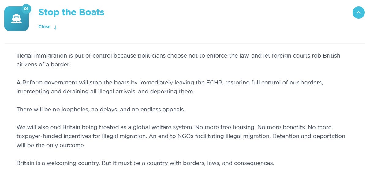 Let us first address, one by one, the criticisms levied at Reform in recent months. The first, and most general, is that Reform’s policy on immigration and deportations does not go far enough to address the challenges our country faces. I will not say that there is no truth in this — the scale of what is required is indeed remarkable. Yet nobody would suggest it is possible to go from zero to sixty in an instant; as such, the relevant question is how far we can go in what timeframe. On that note, I would invite you to compare the official stances of Reform and Restore, rather than taking the words of supporters of either party on X as policy commitments.