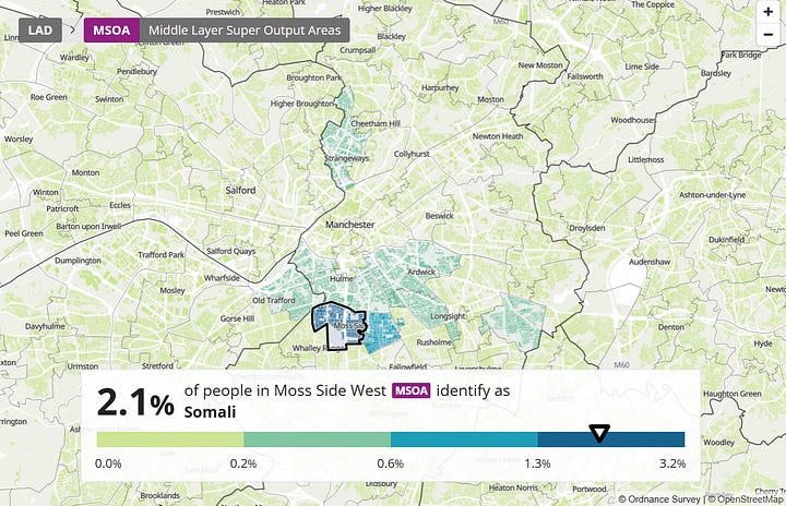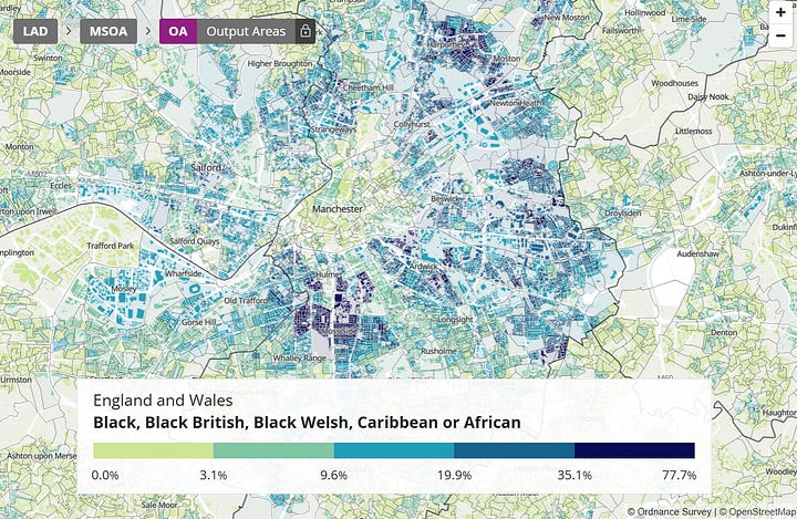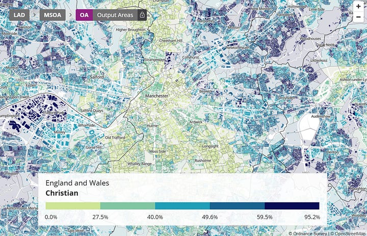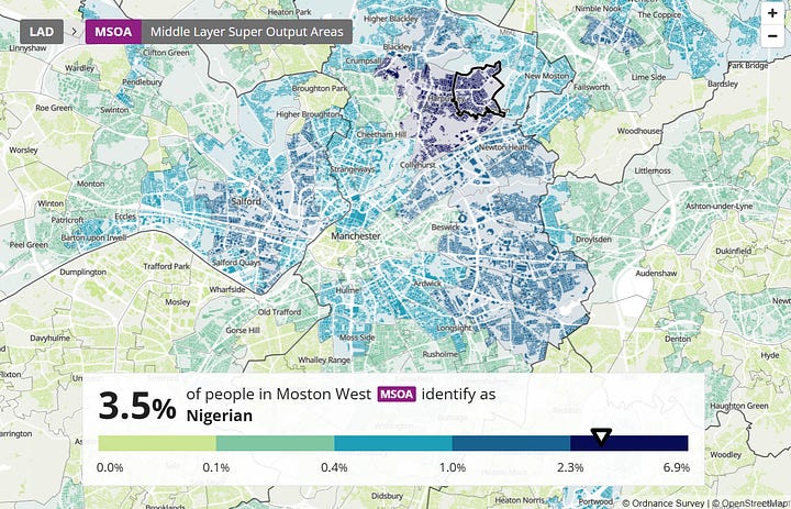We can also look at Manchester (Figures 5 and 6). It may first look like an exception, as there seems to be a significant black community around Moss Side that does not practice Christianity at all. This exception, however, can be accounted for when we factor in national identity: Moss Side turns out to be a Somali community. We also find that those areas of Manchester with more West African, e.g. Nigerian (Figure 8), around East Manchester are more Christian than other areas.