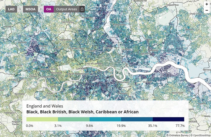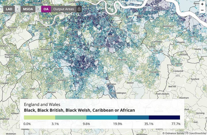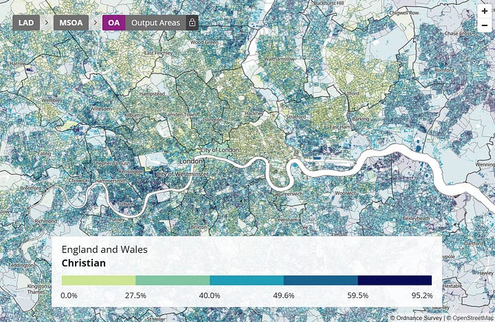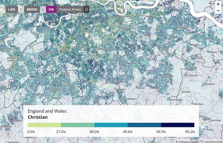 On the other hand, Chelsea, Fulham, and Kensington are a clear exception here, since these areas seem comparatively white and also comparatively Christian. This can perhaps be explained by the unique demographics of such an area of London. Such an area is not seriously comparable to the rest of London, let alone the rest of the country. But other than this exception, there is otherwise an obvious correlation between people who identify as Christian and people who identify as black in London.