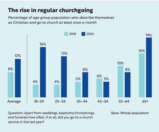 The primary evidence for the Christian revival comes from the aforementioned Bible Society study. The study compares two polls conducted on behalf of the Bible Society, one in 2018 and one in 2024. They find that in 2024, 16% of those aged between 18 and 24 identify as Christian and go to church at least once a month, compared to only 4% in 2018. There is an increase among all age groups and across both genders, though by far the most significant increase is for those aged between 18 and 24.